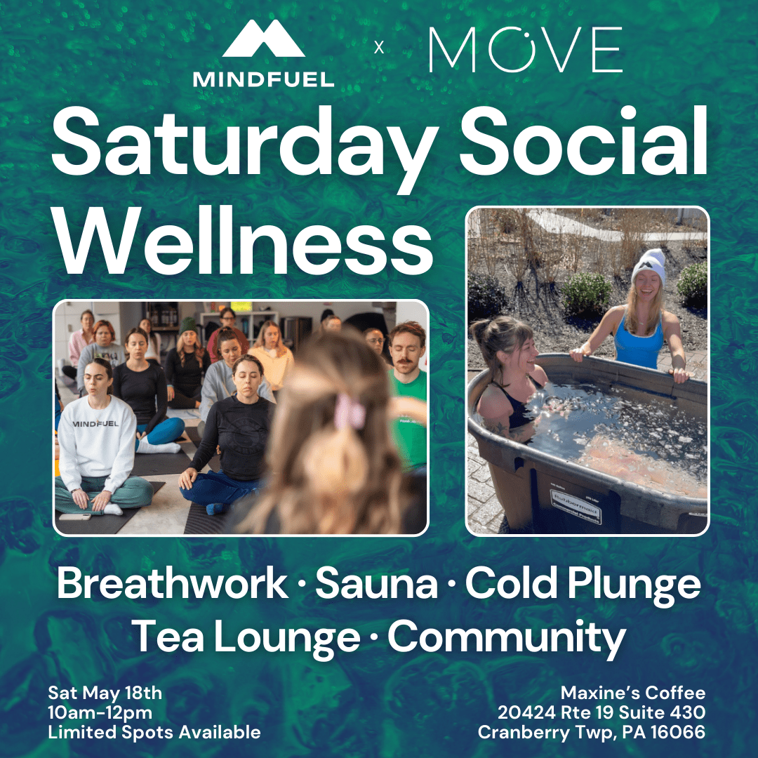 Join us May 18, 2024 at Maxine’s Coffee in Cranberry, PA for the MindFuel x Move Saturday Social Wellness Event. Experience the collective energy of like-minded individuals as you relax and rejuvenate with expert-lead breathwork, shared sauna, guided cold plunges, and connection.